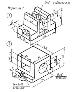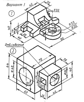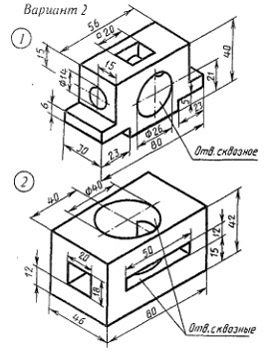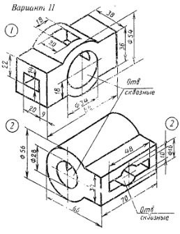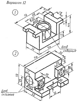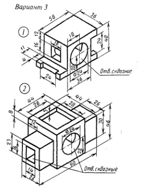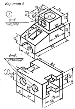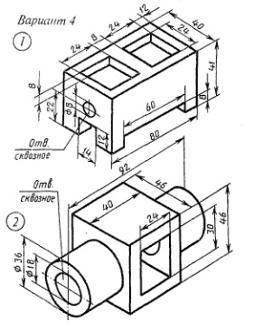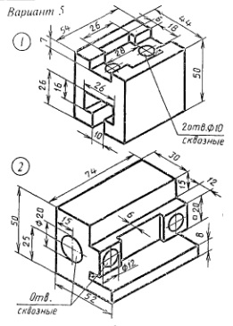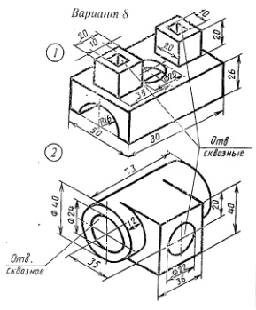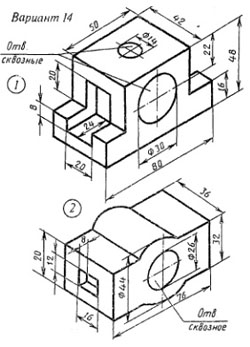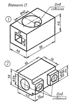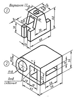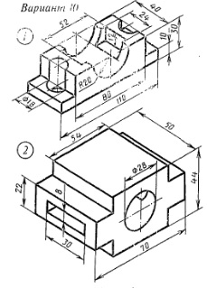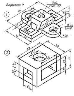 По аксонометрической проекции модели построить в трех проекциях чертеж. Задача 1 - с применением фронтального разреза Задача 2 - с применением горизонтального разреза.