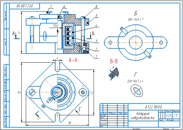 Катушка служит в качестве элемента колебательного контура, задачей которого является фильтрация радиосигналов, совпадающих по частоте с резонансной частатой, образованной индуктивностью и емкостью. Применяется катушка в радиоприемниках, радеопередающих и других устройствах, производящих селекцию радиосигналов по частоте. Устройство катушки простое. Основание 1 является армированным пластмассовым изделием. Арматура в виде резьбовых втулок выполнена из латуни марки Л63. Катушка 2 состоит из пластмассового каркаса и провода. При перемещении сердечника 6 вдоль оси катушки 2 изменяется индуктивное сопротивление, отчего в контуре изменяется частота колебаний. Последовательность сборки катушки Основание 1 изготавливают в пресс-форме. Катушку 2 вставляют в нижний броневой сердечник 3, накрывают верхним броневым сердечником 4 и вкладывают в гнездо основания 1. Затем верхний броневой сердечник накрывают крышкой 5 и крепят винтами 8. Подстрочный сердечник 6 завинчивается в броневой сердечник 4. Катушка индуктивности 01.22.00.00 сб Катушка индуктивности 01.22.00.00 спецификация Катушка индуктивности 01.22.00.00 3d модель Катушка индуктивности 01.22.00.00 чертежи Основание 01.22.01.00 Катушка 01.22.02.00 Сердечник броневой 01.22.00.03 Сердечник броневой 01.22.00.04 Крышка 01.22.00.05 Сердечник 01.22.00.06 Лепесток 01.22.00.07