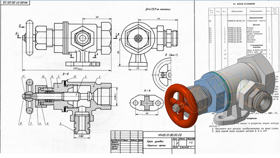 Кран угловой устанавливается на трубопроводах для регулирования подачи жидкости или газа. Кран с помощью двух штуцеров 5 (второй штуцер не изображен) присоединяется к трубопроводу. На чертеже кран изображен в закрытом положении. Чтобы открыть кран, необходимо повернуть маховик против часовой стрелки. Маховик скреплен со шток-клапаном 3. При вращении шток-клапана образуется зазор для прохода жидкости ил газа. Для уплотнения шток клапана служит сальниковое устройство , состоящие из втулки 6, колец 8,10 и гайки накидной 4.